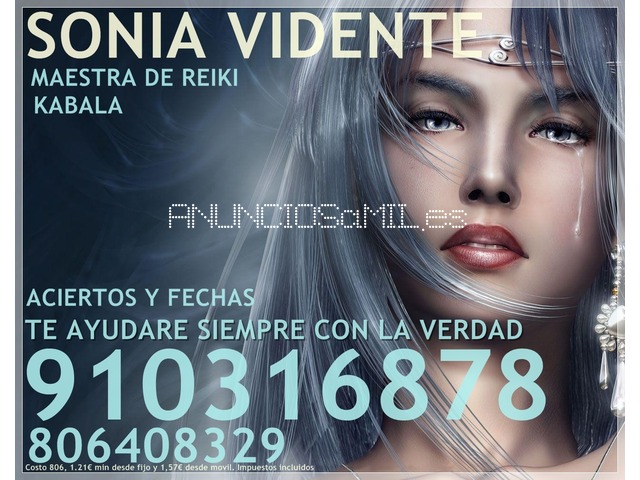 Mi nombre es Sonia, soy vidente de nacimiento, maestra de Reiki y experta en lectura de Kabbalah. Durante mis consultas renovare toda tu energÃa vital para obtener la paz y el equilibrio que necesitas. Iré a la raÃz de tus problemas, te dire toda la verdad, sin mentiras ni engaños y te guiare para que puedas encontrar la felicidad . Pago seguro con tarjeta. 11€ 17minutos. 910 31 68 78