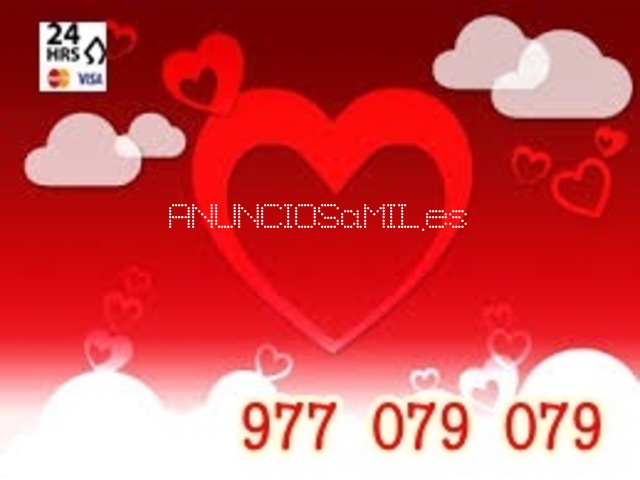 Toda la verdad al momento. Tarot del amor el que te podrá decir como es la persona que tú necesitas para tu vida como compañero a para que viva contigo, No lo dudes, llámanos y sal de dudas. INTRODUCE TU MISMA LOS DATOS,NO TE FIES,NI DES TUS DATOS A DESCONOCIDOS Consigue tu PACK-MINUTOS la locucion te pedirá los numeros de tu tarjeta,compra el lote que desees,puedes consumir los minutos de tu lote en varias llamadas,los minutos se guardan en una cuenta asociados a tu numero de teléfono 977 079 079, 15 minutos 4,5€, 30 minutos 8€, 24H.PAGO POR TARJETA,PAGO SEGURO Y DISCRETO mayores 18
